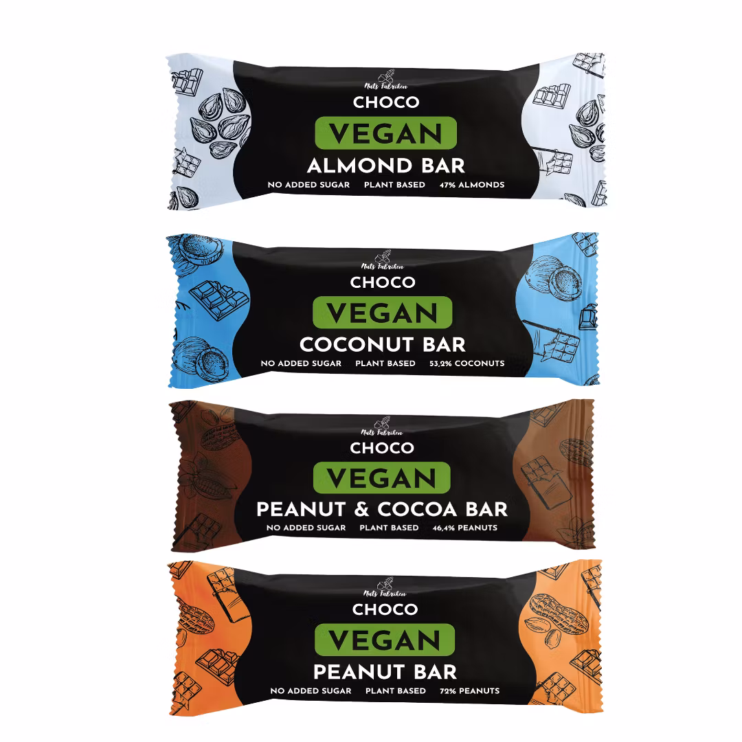 Mix av 4 x 40g choco vegan bar. Smaker: Almond, Coconut, Peanut, Peanut&Cocoa.